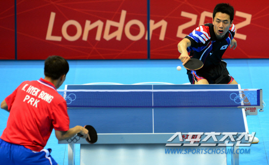 2012 런던올림픽 탁구대표팀의 주세혁(오른쪽)이 30일(현지시간) 런던의 엑셀 런던에 위치한 올림픽 탁구 경기장에서 열린 탁구 남자 단식 3라운드(32강)에서 북한의 김혁봉과 만나 뜨거운 대결을 펼치고 있다.