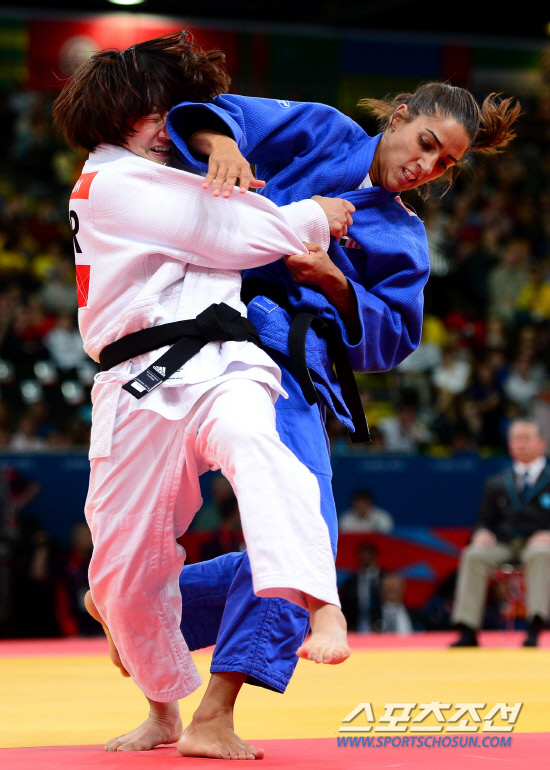 여자유도 57kg급 김잔디가 30일 런던 엑셀 노스아레나 경기장에서 펼쳐진 예선전 16강에서 이탈리아 퀸타발레에게 패하며 8강 진출에 실패 했다. 경기를 치르고 있는 김잔디(흰색도복).