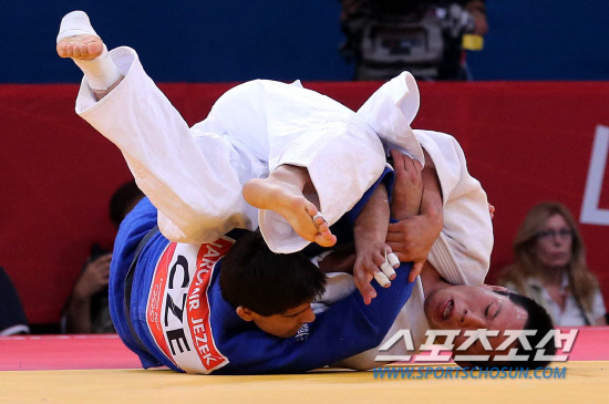 왕기춘이 30일 영국 런던 엑셀 노스 아레나에서 열린 2012년 런던올림픽 남자 유도 72㎏ 16강전에서 체코의 야로미르 예젝을 연장 끝에 절반으로 승리한 공격을 하고 있다.