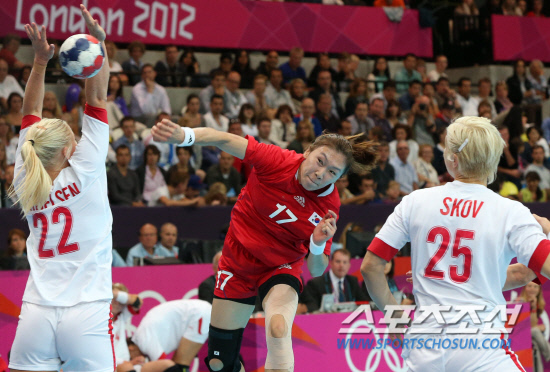 30일 런던올림픽 핸드볼 경기장인 핸드볼 아레나에서 열린 한국과 덴마크전에서 심혜인이 덴마크 수비를 뚫고 슛을 날리고 있다. 한국은 25:24 한점차로 이겼다. 20120739. 런던=올림픽사진공동취재단b