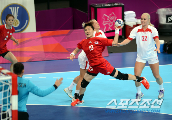 30일 오후(한국시간) 영국 런던 올림픽파크 내 코퍼 복스에서 열린 런던올림픽 핸드볼 여자 조별리그 B조 2차전 덴마크와의 경기에서 최임정이 슛을 날리고 있다.