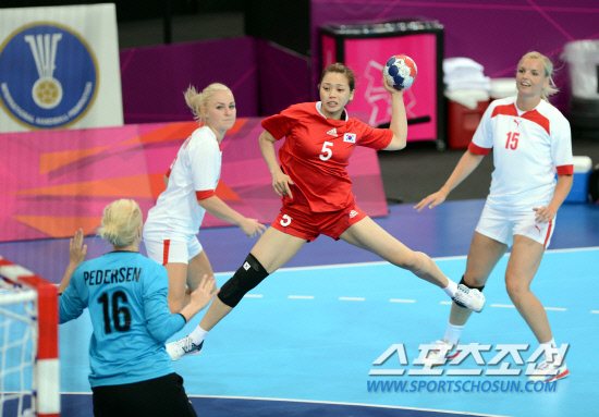 30일 오후(한국시간) 영국 런던 올림픽파크 내 코퍼 복스에서 열린 런던올림픽 핸드볼 여자 조별리그 B조 2차전 덴마크와의 경기에서 정유라가 슛을 날리고 있다.