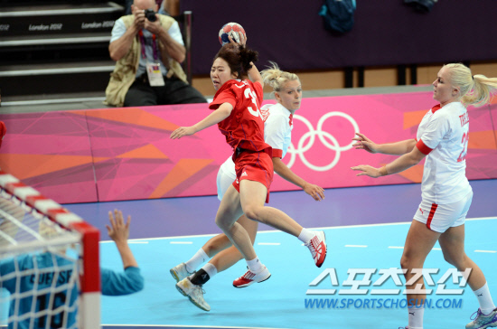 30일 오후(한국시간) 영국 런던 올림픽파크 내 코퍼 복스에서 열린 런던올림픽 핸드볼 여자 조별리그 B조 2차전 덴마크와의 경기에서 이은비가 슛을 날리고 있다.