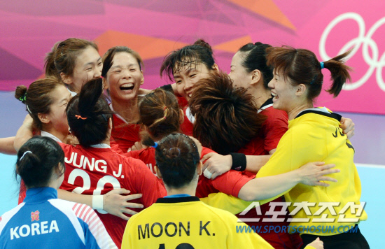 한국 여자 핸드볼 대표팀이 30일 오후(한국시간) 영국 런던 올림픽파크 내 코퍼 복스에서 열린 런던올림픽 핸드볼 여자 조별리그 B조 2차전 덴마크와의 경기에서 25-24로 이긴뒤 기뻐하고 있다. 2012.7.30 올림픽사진공동취재단c