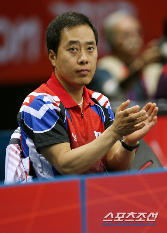 30일오전(현지시각) 영국 런던 엑셀 노스아레나2에서 열린 남자 탁구 단식 예선전 3라운 오상은 대 마코스 프레이타스(포루투갈)의 경기에서 유남규 감독이 박수를 보내고 있다. 20120730 런던=올림픽사진공동취재단m