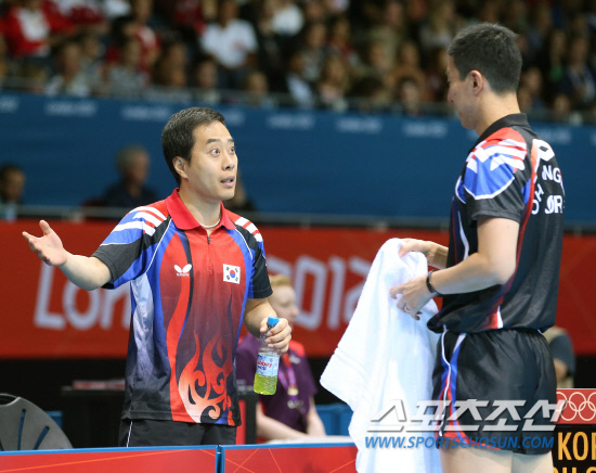 30일오전(현지시각) 영국 런던 엑셀 노스아레나2에서 열린 남자 탁구 단식 예선전 3라운 오상은 대 마코스 프레이타스(포루투갈)의 경기에서 유남규 감독이 지시를 하고 있다. 20120730 런던=올림픽사진공동취재단m