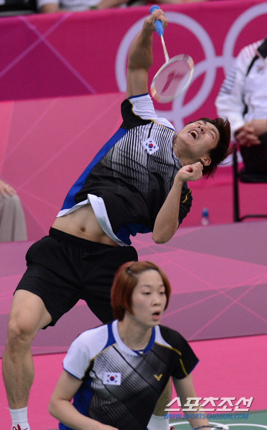 배드민턴 혼합복식에 하정은과 같이 출전한 이용대가 30일(현지시간) 웸블리 아레나에서 열린 덴마크와의 경기에서 강력한 스매싱 공격을 하고 있다.