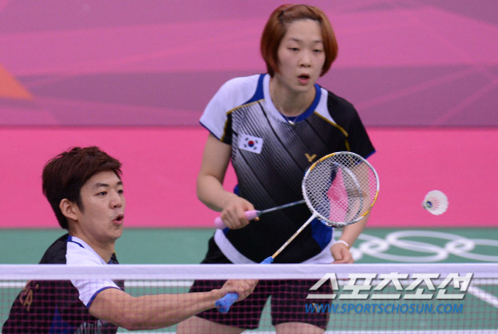 배드민턴 혼합복식에 하정은과 같이 출전한 이용대가 30일(현지시간) 웸블리 아레나에서 열린 덴마크와의 경기에서 드라이브 공격을 하고 있다.