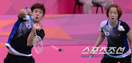 배드민턴 혼합복식에 하정은과 같이 출전한 이용대가 30일(현지시간) 웸블리 아레나에서 열린 덴마크와의 경기에서 드라이브 공격을 하고 있다.