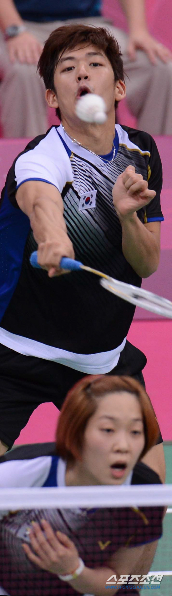 배드민턴 혼합복식에 하정은과 같이 출전한 이용대가 30일(현지시간) 웸블리 아레나에서 열린 덴마크와의 경기에서 드라이브 공격을 하고 있다.