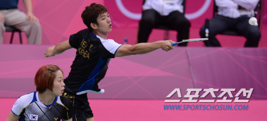배드민턴 혼합복식에 하정은과 같이 출전한 이용대가 30일(현지시간) 웸블리 아레나에서 열린 덴마크와의 경기에서 백 드라이브 공격을 하고 있다.