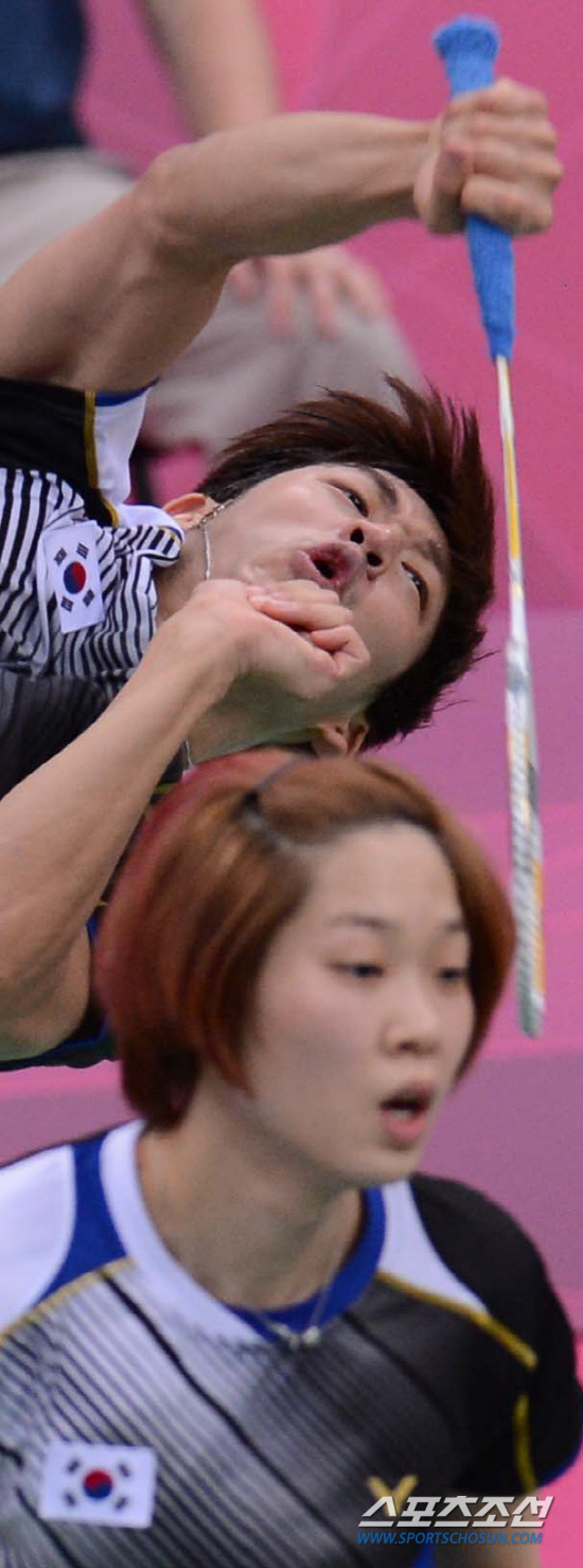 배드민턴 혼합복식에 하정은과 같이 출전한 이용대가 30일(현지시간) 웸블리 아레나에서 열린 덴마크와의 경기에서 강력한 스매싱 공격을 하고 있다.