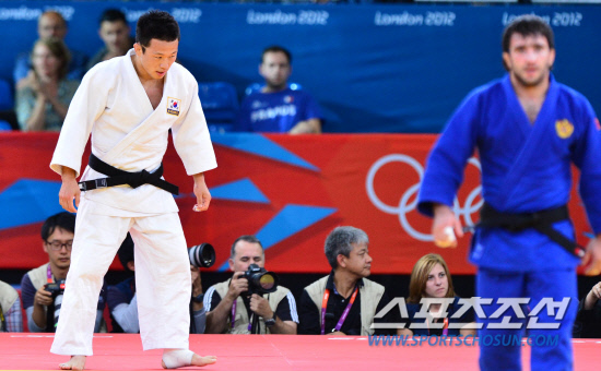 왕기춘이 30일 런던 엑셀 노스아레나 경기장에서 열린 남자유도 73kg급 준결승전에서 러시아 만수르 이사예프에 유효패를 당해 결승행이 좌절되자 허탈한 표정을 짓고 있다.