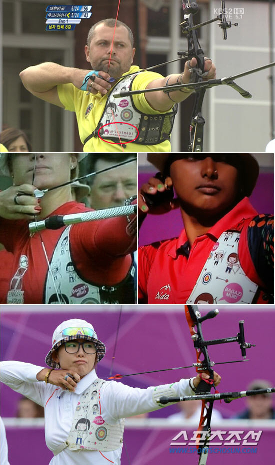 '바가지 머리'는 우리나라 양궁여자 대표팀과 각각 16강, 8강에서 붙은 인도네시아 여자선수와 덴마크 여자 선수의 가슴에서도 포착됐다. 이들은 깜찍한 캐릭터와 함께 영어로 'BAGAZI MURI'라고 새겨져 있는 가슴 받이(보호대)를 착용해 TV화면 속 중계에 잡힐 때마다 눈길을 끌었다.