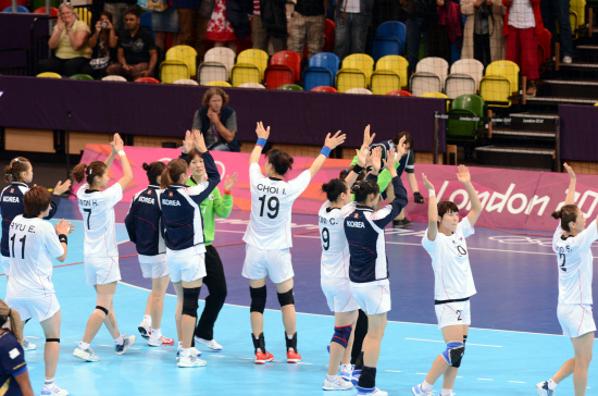 ◇여자 핸드볼대표팀이 2012년 런던올림픽 예선에서 2연승을 달렸다. 28일 스페인과의 1차전에서 승리한 한국 선수단이 관중석을 향해 인사하고 있다. 런던=올림픽사진공동취재단