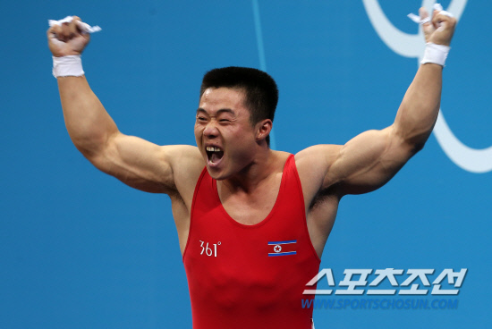 30일오전(현지시각) 영국 런던 엑셀 노스아레나2에서 열린 남자 역도 62㎏급 결승전에서 금메달을 딴 김은국(북한)선수가 환호하고 있다. 김은국은 인상 153㎏, 용상 174㎏, 합계 324㎏을 기록해 금메달을 목에 걸었다. 20120730 런던=올림픽사진공동취재단m