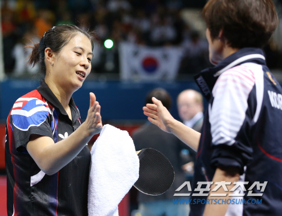 30일오전(현지시각) 영국 런던 엑셀 노스아레나2에서 열린 여자 탁구 단식 16강전에서 김경아 선수가 센얀페이(스페인)를 상대로 승리한 뒤 현정화 감독과 하이파이브를 하고 있다. 김경아는 세트스코어 4:1으로 승리를 거둬 8강에 안착했다. 20120730 런던=올림픽사진공동취재단m
