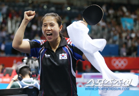 30일오전(현지시각) 영국 런던 엑셀 노스아레나2에서 열린 여자 탁구 단식 16강전에서 김경아 선수가 센얀페이(스페인)를 상대로 승리한 뒤 환호하고 있다. 김경아는 세트스코어 4:1으로 승리를 거둬 8강에 안착했다. 20120730 런던=올림픽사진공동취재단m
