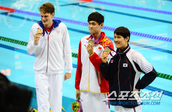 30일(현지시간) 오후 올림픽파크 아쿠아틱센터에서 열린 수영 남자 200m 자유형에서 공동 은메단을 딴 박태환과 쑨양이 시상식에서 나란히 포즈를 취하고 있다. 우승은 프랑스의 야닉 아넬. 20120730. 런던=올림픽사진기자단e