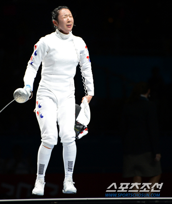 2012 런던올림픽 펜싱대표팀의 신아람이 30일 런던의 엑셀 런던의 사우스 아레나에서 열린 여자 에페 준결승에서 브리타 하이데만(독일)과 연장까지 가는 접전을 펼친 끝에 석연치 않은 판정으로 패한 뒤 눈물을 쏟고 있다.