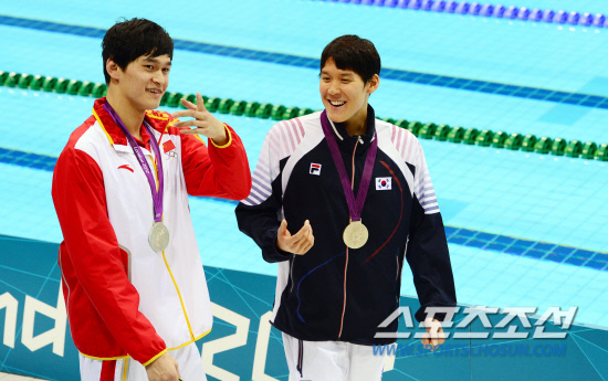 30일(현지시간) 오후 올림픽파크 아쿠아틱센터에서 열린 수영 남자 200m 자유형에서 공동 은메단을 딴 박태환과 쑨양이 시상식 후 밝은 표정으로 경기장을 나서고 있다.20120730. 런던=올림픽사진기자단e
