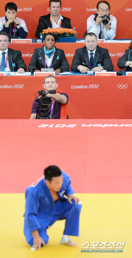 2012 런던올림픽 유도대표팀의 왕기춘이 30일(현지시간) 런던의 엑셀 런던에 위치한 올림픽 유도 경기장에서 열린 남자 73kg급 동메달 결정전에서 우고 르그랑(프랑스)과 대결하는 가운데, 박용성 대한체육회장이 관계자석에 앉아 DSLR 카메라로 촬영에 열을 올리고 있다.