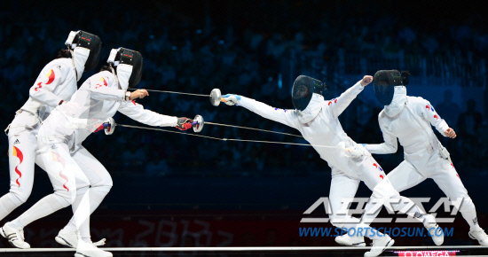 한국 여자 펜싱 대표팀 신아람(사진오른쪽)이 30일 저녁(현지시간) 영국 엑셀 런던 사우스 아레나에서 열린 중국 쑨위지에와 동메달 결정전에서 날카로운 공격을 하고 있다.(사진은 다중촬영을 한 장면이다.)