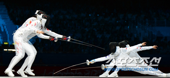 한국 여자 펜싱 대표팀 신아람(사진오른쪽)이 30일 저녁(현지시간) 영국 엑셀 런던 사우스 아레나에서 열린 중국 쑨위지에와 동메달 결정전에서 상대방의 발을 공격하고 있다.