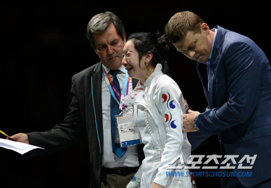 2012 런던올림픽 펜싱대표팀의 신아람이 30일 런던의 엑셀 런던의 사우스 아레나에서 열린 여자 에페 준결승에서 브리타 하이데만(독일)과 연장까지 가는 접전을 펼친 끝에 석연치 않은 판정으로 패한 뒤 경기가 진행된 코트에 주저 앉아 재심을 기다리던 중 관계자들에게 코트 밖으로 이끌리며 눈물을 쏟고 있다.