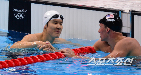 30일(현지시간) 오후 올림픽파크 아쿠아틱센터에서 열린 수영 남자 200m 자유형에 출전한 박태환이 골인 후 미국의 로체와 악수하고 있다. 박태환은 중국의 쑨양과 공동 2위를 기록했다. 우승은 프랑스의 야닉 아넬. 20120730. 런던=올림픽사진기자단e