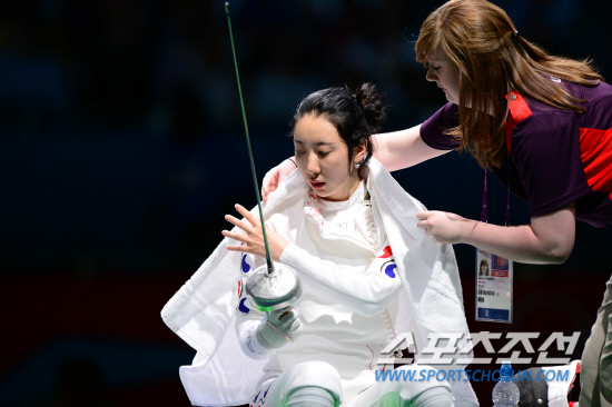 런던 올림픽 여자 에페 개인전 준결승에서 시계가 멈추는 어이없는 상황이 벌어졌다. 한국 여자 펜싱계의 기대주 신아람(26·계룡시청)이 30일(현지시간) 영국엑셀 런던 사우스 아레나에서 열린 에페 개인전 준결승에서 브리타 하이데만(독일)에게 5-6으로 어이없는 패배를 당해 펜싱코트를 떠나지 않차 한 자원봉사자가 수건을 감싸주고 있다.