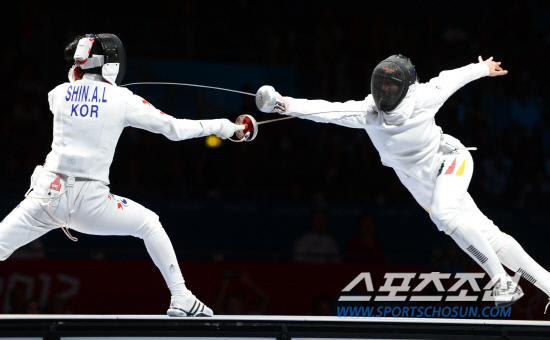 2012 런던올림픽 펜싱대표팀의 신아람(왼쪽)이 30일 런던의 엑셀 런던의 사우스 아레나에서 열린 여자 에페 준결승에서 브리타 하이데만(독일)과 연장까지 가는 접전을 펼치고 있다.