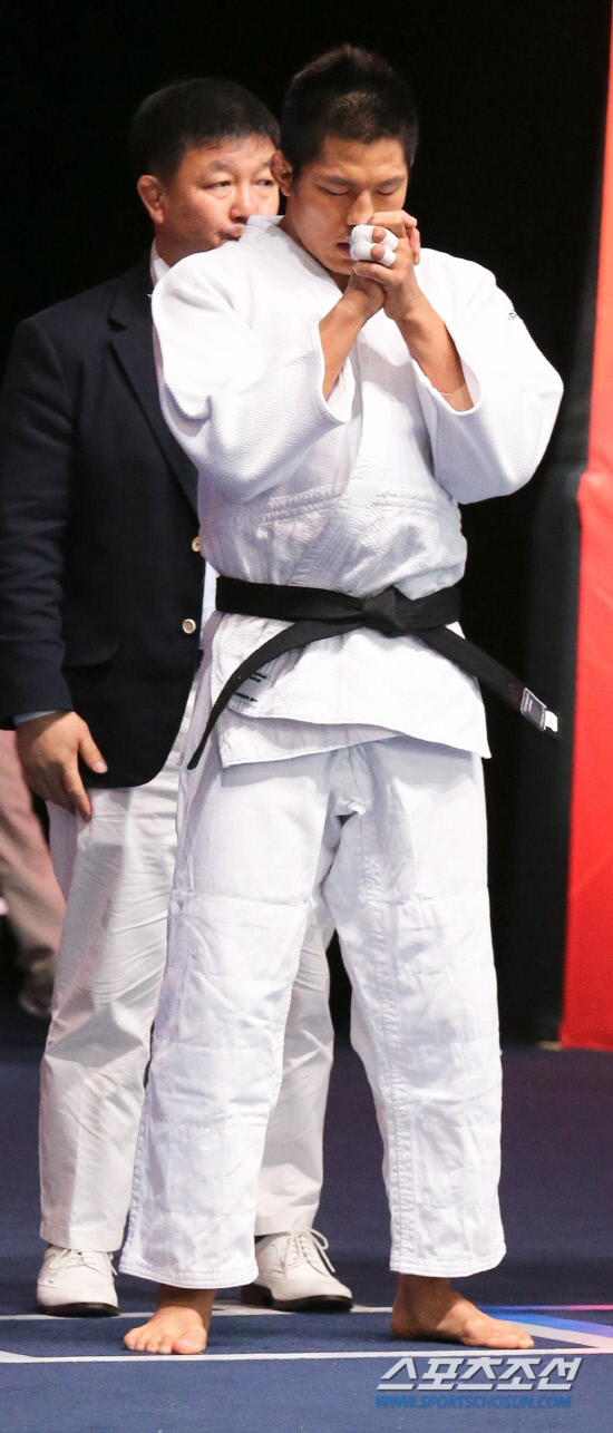 유도 81kg이하급에 출전한 한국의 김재범이 31일 오전(현지시각) 런던 엑셀런던에서 열린 32강전이 열리기 전 기도를 하고 있다. 김재범은 우즈베키스탄의 야크효 이마모프를 유효로 꺽고 16강에 진출했다.