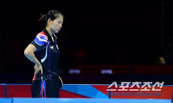 31일(현지시간) 엑셀 경기장에서 열린 여자 탁구 단식 경기에 출전한 김경아가 8강전에서 경기도중 실점하자 아쉬운 표정을 짓고 있다. 김경아의 패배로 한국 여자 탁구는 개인 단식에서 메달권 진입에 실패했다. 12020731. 런던=올림픽사진기자단E