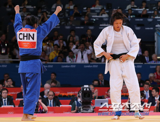여자 유도 63kg이하급에 출전한 한국의 정다운이 31일 오후(현지시각) 런던 엑셀런던 노스아레나에서 열린 준결승에서 중국 쉬리리에게 패한 뒤 고개를 떨구고 있다.