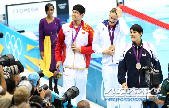 박태환 선수가 30일 런던올림픽 수영경기장인 아쿠아틱스 센터에서 열린 남자 자유형 200m 경기에서 은메달을 수상한 뒤 관중석을 향해 미소짓고 있다. 20120730. 런던=올림픽사진공동취재단b