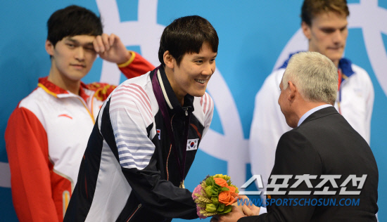 30일 런던 올림픽파크 아쿠아틱스센터에서 열린 런던올림픽 남자 자유형 200미터에서 은메달을 차진한 한국의 박태환선수가 시상식에서 은메달을 수여받고 있다./20120730런던=올림픽사진공동취재단g