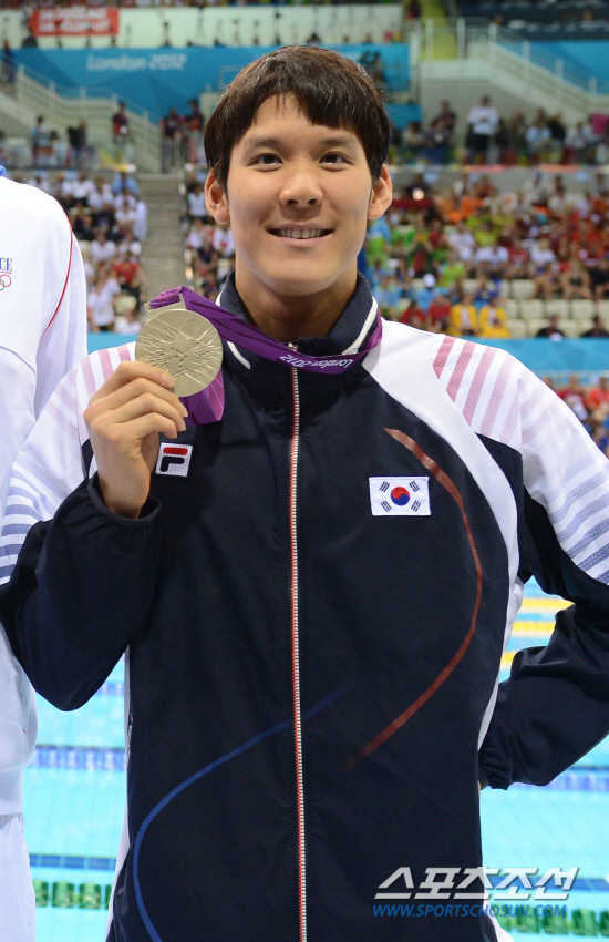 30일 런던 올림픽파크 아쿠아틱스센터에서 열린 런던올림픽 남자 자유형 200미터에서 은메달을 차지한 한국의 박태환선수가 시상식을 마친뒤 관중석에 메달을 들어보이고 있다. /20120730런던=올림픽사진공동취재단g