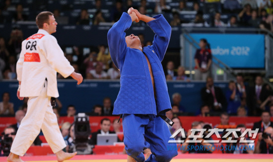 남자 유도 81kg이하급에 출전한 한국의 김재범이 31일 오후(현지시각) 런던 엑셀런던 노스아레나에서 열린 결승전에서 독일의 올레 비쇼프을 상대로 금메달을 따낸 뒤 함성을 지르고 있다.