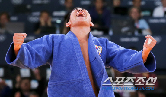 남자 유도 81kg이하급에 출전한 한국의 김재범이 31일 오후(현지시각) 런던 엑셀런던 노스아레나에서 열린 결승전에서 독일의 올레 비쇼프을 상대로 금메달을 따낸 뒤 함성을 지르고 있다.