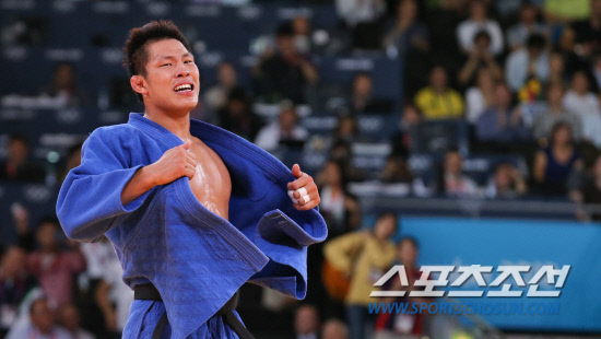 남자 유도 81kg이하급에 출전한 한국의 김재범이 31일 오후(현지시각) 런던 엑셀런던 노스아레나에서 열린 결승전에서 독일의 올레 비쇼프을 상대로 금메달을 따낸 뒤 기뻐하고 있다.