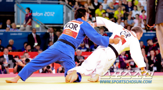 남자 유도 81kg이하급에 출전한 한국의 김재범이 31일 오후(현지시각) 런던 엑셀런던 노스아레나에서 열린 결승전에서 독일의 올레 비쇼프을 상대로 첫번째 유효를 따내고 있다. 김재범은 이날 금메달을 차지했다.