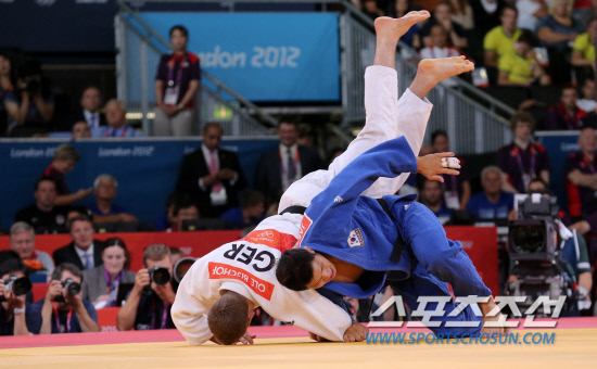 남자 유도 81kg이하급에 출전한 한국의 김재범이 31일 오후(현지시각) 런던 엑셀런던 노스아레나에서 열린 결승전에서 독일의 올레 비쇼프을 상대로 공격을 하고 있다.