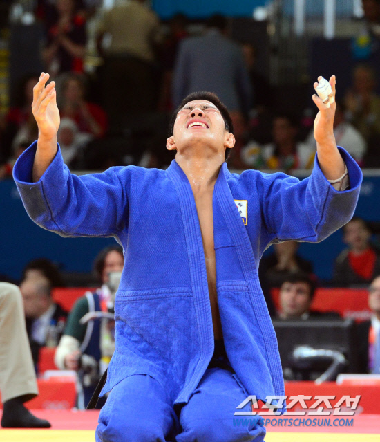 남자 유도 81kg이하급에 출전한 한국의 김재범이 31일 오후(현지시각) 런던 엑셀런던 노스아레나에서 열린 결승에서 우승한 후 무릎을 꿇고 감격해하고 있다. 20120731런던=올림픽사진공동취재단e