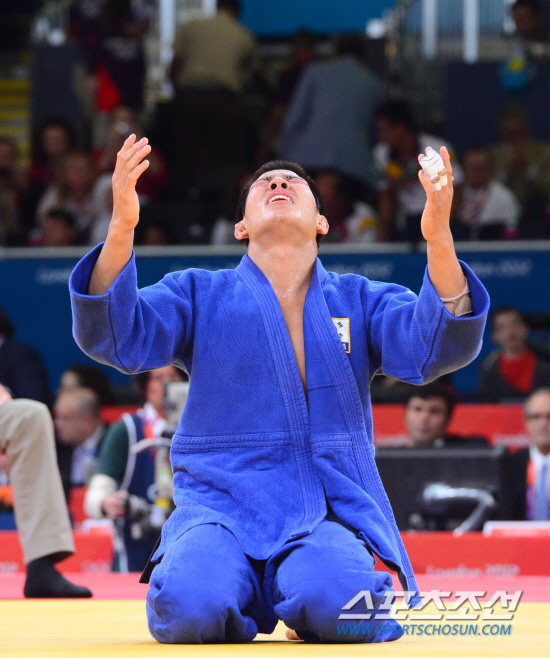 남자 유도 81kg이하급에 출전한 한국의 김재범이 31일 오후(현지시각) 런던 엑셀런던 노스아레나에서 열린 결승에서 우승한 후 무릎을 꿇고 감격해하고 있다. 20120731런던=올림픽사진공동취재단e