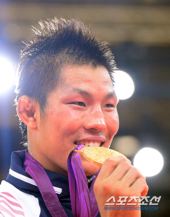 남자 유도 81kg이하급에서 우승한 김재범이 31일 오후(현지시각) 런던 엑셀런던 노스아레나에서 열린 시상식에서 금메달을 물어보고 있다.20120731런던=올림픽사진공동취재단e