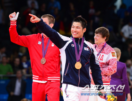 남자 유도 81kg이하급에 금메달을 딴 김재범이 31일 오후(현지시각) 런던 엑셀런던 노스아레나에서 열린 시상식에서 검지손가락을 뻗어 기쁨을 표시하고 있다. 20120731런던=올림픽사진공동취재단e
