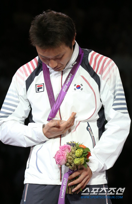 남자 펜싱 플뢰레에서 동메달을 딴 한국의 최병철이 31일 저녁(현지시각) 런던 엑셀 런던 사우스 홀에서 열린 시상식에서 메달을 받은 뒤 들여다보고 있다.