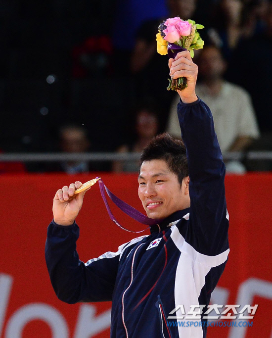 남자 유도 81kg이하급에 금메달을 딴 김재범이 31일 오후(현지시각) 런던 엑셀런던 노스아레나에서 열린 시상식에서 메달과 꽃다발을 들고 관중들의 환호에 답하고 있다. 20120731런던=올림픽사진공동취재단e