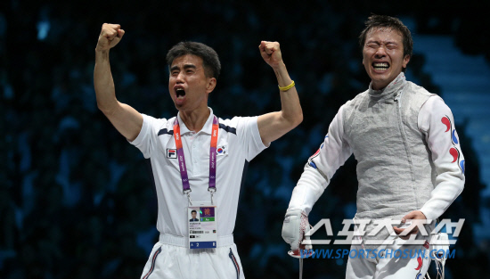 한국 펜싱 국가대표 최병철이 31일 저녁(현지시각) 런던 엑셀 런던 사우스 홀에서 열린 남자 펜싱 플뢰레 개인전 동메달 결정전에서 이탈리아의 안드레아 발디니에게 승리한 뒤 이정현 코치와 함께 환호하고 있다.